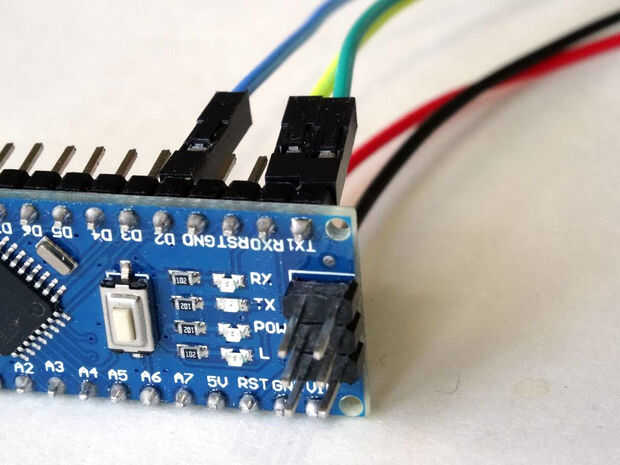 1. Conecte uno de los cables de jumper Hembra-hembra (alambre negro) al conector de tierra de la Arduino Nano (foto 1)