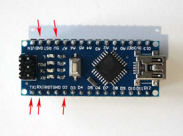 6. Cuadro 4 muestra dónde están la tierra, 5V potencia, Digital 2, RXy TX, pines del Arduino Nano