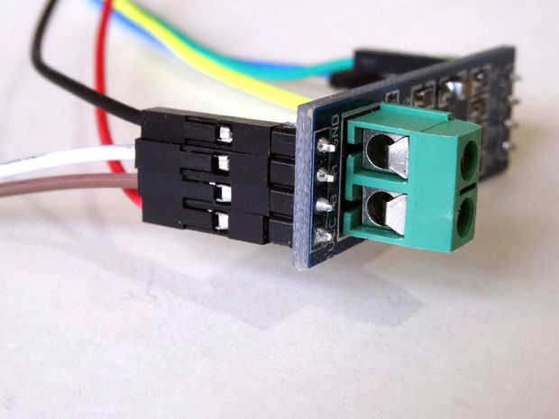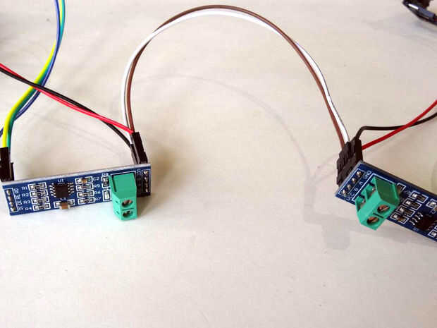 La RS485 utiliza sólo 2 hilos. Cada dispositivo está conectado a los 2 cables (foto 1). Hay algunas resistencias que se necesitan, sin embargo los Módulos MAX485 que utilizamos tienen estas resistencias ya instalados, así que nos podemos conectar directamente los módulos con sólo 2 conductores.