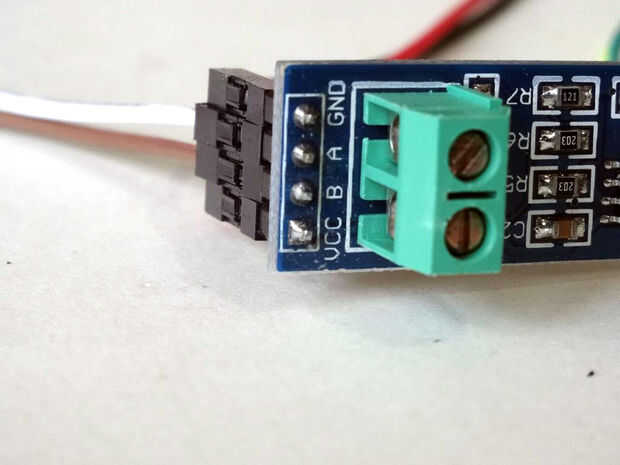 3. Conecte el otro extremo de un alambre de A(cable blanco) con el conector "A" del otro Módulo RS485 (foto 2 y 3 y 4)