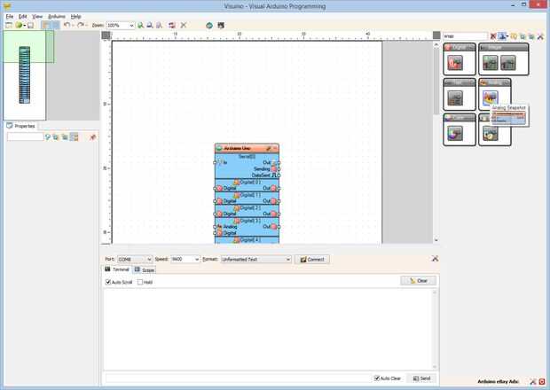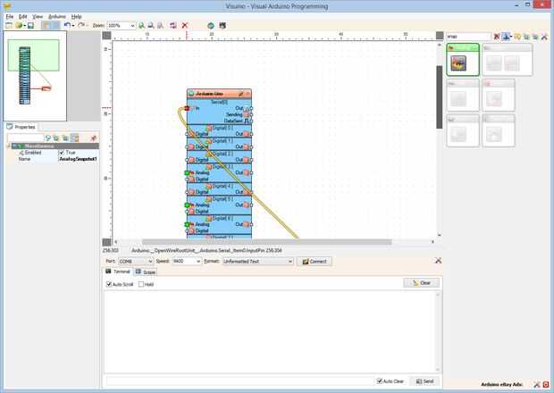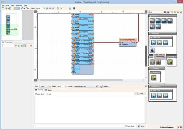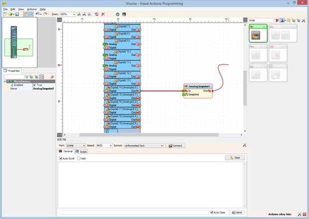 Te enviaremos a la serie el valor del canal análogo 0 de una vez por segundo. Para ello es necesario utilizar el componente "Analógica instantánea" y a lo del reloj una vez por segundo con el "Generador de reloj":