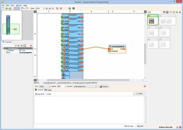 2. Conectar la clavija "a" de la "Digital [14] / AnalogIn [0]" canal del componente de Arduino para el "en" el pin del componente AnalogSnapshot1 (foto 2)
