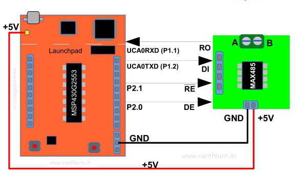 Los pines UART de MSP430G2553 están conectados al chip MAX485 pines P2.0 y P2.1 se usan para seleccionar el recibir y transmitir modos del MAX485.