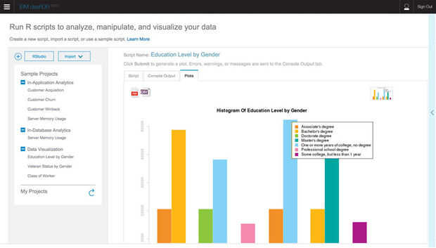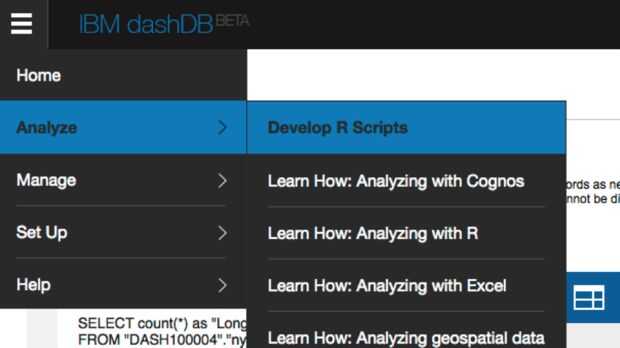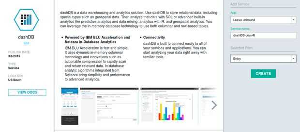 Abrir el servicio de DashDB del salpicadero Bluemix y haga clic en la ficha de análisis donde la opción de secuencia de comandos de desarrollar r estará disponible. traerá a la r en línea donde el id de usuario y la contraseña pueden encontrarse en la configuración de la conexión dashDB.