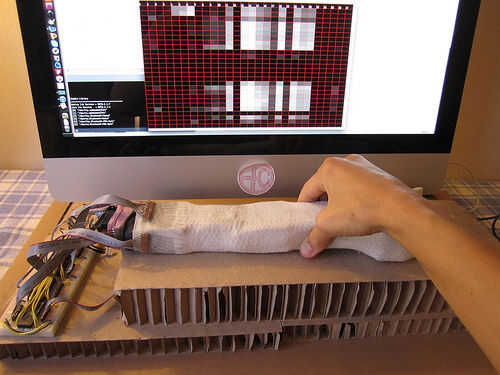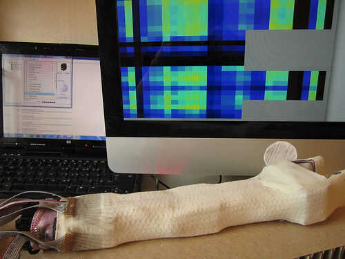 Cerrar la ventana de serial monitor de Arduino y ejecute el código de procesamiento. Debe abrir una nueva ventana y debe mostrar un mapa de calor que se ve algo así como en los siguientes fotos. Ejerciendo presión sobre la piel en diferentes lugares debe corresponder a las localizaciones en la visualización.