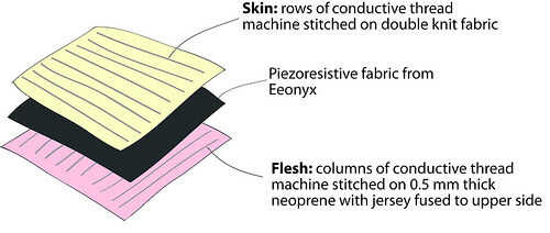 rSkin se hace de materiales elásticos por lo que puede caber firmemente sobre el brazo del robot. La conductoras filas y columnas son cosidas con un hilo conductor a las piezas adyacentes de materiales elásticos no conductores (sustratos base). Tela elástica piezorresistivo se intercala entre las conductoras filas y columnas y actúa como una capa sensible de la presión. Piezorresistivo materiales tienen la propiedad de que su resistencia eléctrica disminuye bajo bajo tensión mecánica, como la presión.