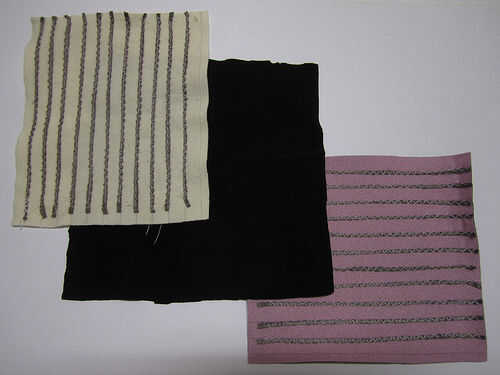 La foto en este paso muestra el conductoras filas y columnas hechas de tiras de tela conductora cosido a sus sustratos base con un hilo (no conductor) regular. Esta foto fue tomada durante la fase de prototipado y mientras que muestran muy bien las capas de la piel (la capa blanca se gira para hacer frente a la capa de color de rosa), en la versión final que cosió las conductoras filas y columnas utilizando hilo conductor, en lugar de usar tiras de tela conductora. Nuestra elección para utilizar el hilo en vez de la tela, vinieron porque reduciendo al mínimo la superficie conductora (una hebra de hilo es más delgada que una tira de tela), aumentamos la gama de sensibilidad a la presión a través de la tela piezorresistivo.