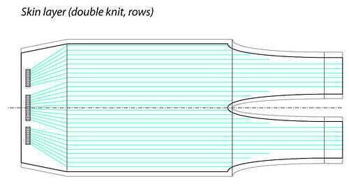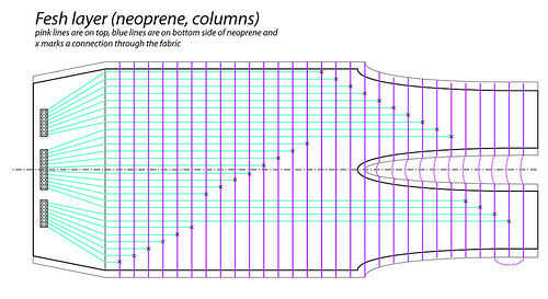 -Nota: el diseño actual es 28 filas de circunferencia, donde cada fila es separada 5mm aparte (circunferencia total = 14cm), mientras que las columnas están espaciadas 1cm, cubriendo una longitud de 28cm. La razón para el espaciamiento de que las columnas más aparte tenía dos razones. La primera fue porque cada columna debe conectarse eléctricamente a un punto central (uno de los extremos de la piel), y en este diseño estas conexiones fueron cosidas en la parte posterior de la tela, que era coincidentemente mitad de ancho (filas) como era amplia (columnas), por lo que estas conectando las filas que llevan a cada una de las columnas fueron separada 0,5 cm de separación que se consideró una distancia de espacio seguro para el riesgo de evitar indeseables interconexiones. La segunda razón fue simplemente para reducir el número de conexiones que necesita para ser cosido para ahorrar tiempo en la producción de.