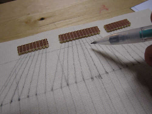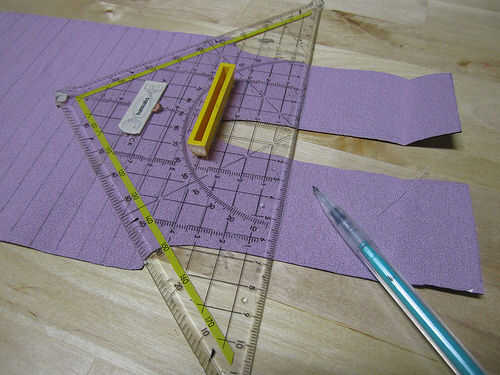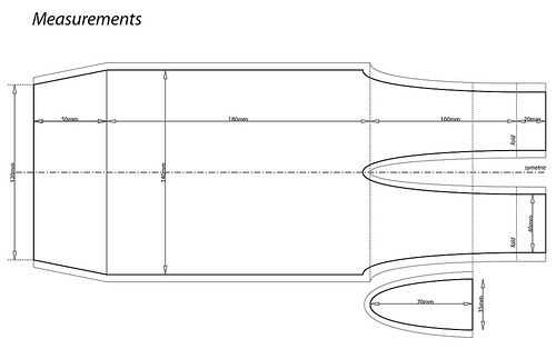 Las mediciones en la plantilla PDF indican distancias para costuras en cm. Tienes que añadir un margen a esto, dependiendo de cuánto su costura cómoda con. Normalmente añadir aproximadamente 5mm, que se indica en la plantilla como un contorno adicional. Después de cortar las formas de los materiales, también traza sus filas y columnas, así como sus conexiones a la placa de circuito perforada (perfboard). Para hacer decisiones sobre los materiales utilice un lápiz de mina blanda o comprar a tela, tiza o marcadores.