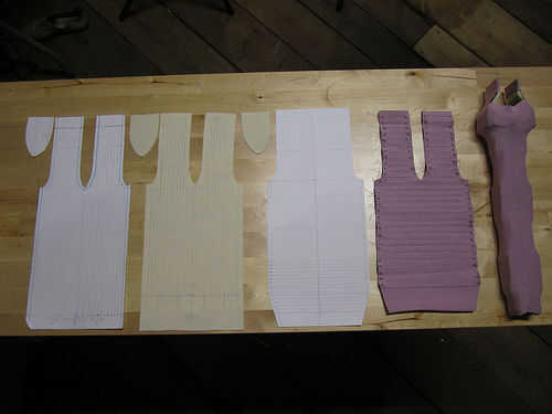 El tamaño A3 siguiente PDF contiene plantillas para las capas de carne, piel y piezorresistivo. Estas plantillas pueden imprimirse 1:1 y transferidas directamente a los materiales. Indican el espaciamiento de la fila o columna y cuentas, así como cómo las filas y columnas conectan eléctricamente al resto del circuito.