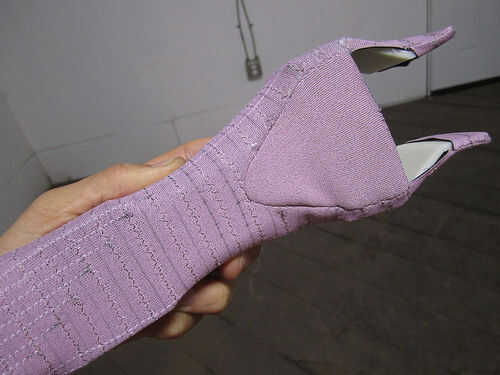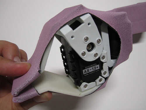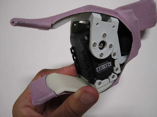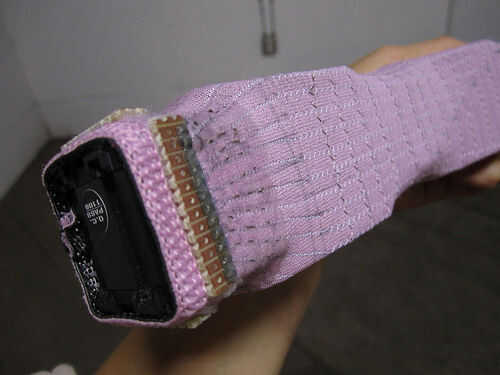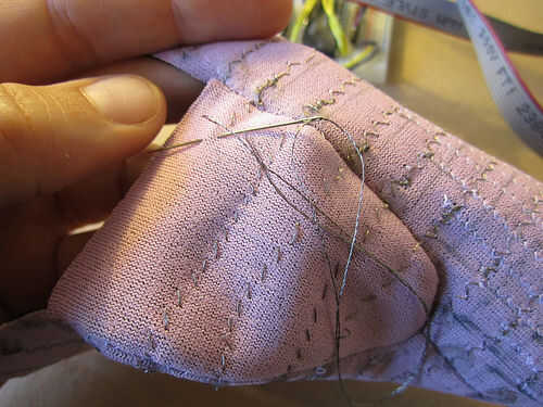 En el diseño actual, estas piezas de tela son zonas no sensibles y se utilice como materia prima para coser las conexiones del hilo conductor adicional de un dedo a otro. Quizá ya notaste que no todas las columnas en cada dedo están conectadas por filas de conector para el perfboards. Estas columnas no conectadas no son parte de la zona sensible y para que sean conectados, el diseño actual considera que estos ser cosidos a mano como se muestra en los siguientes fotos uno al otro. Pero aún, algunas de las columnas en las puntas de los dedos no tienen ningún puente de tela entre los dedos a utilizar para esta conexión y que todavía no he decidido de manera mejor conectarlos.