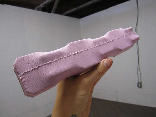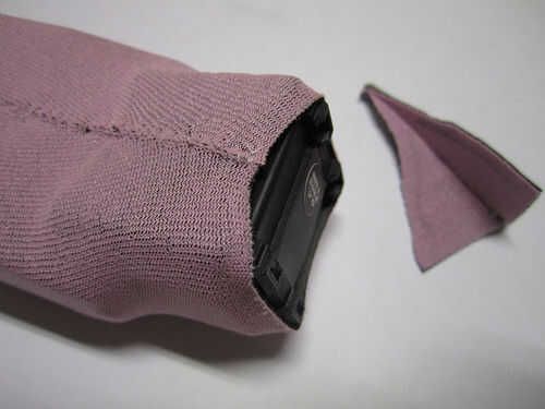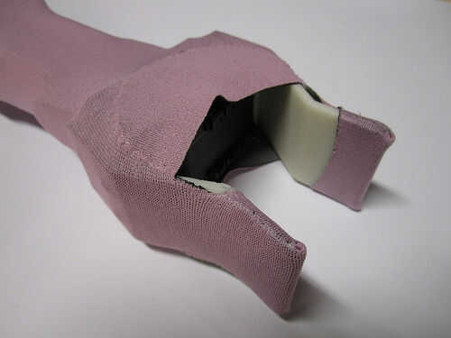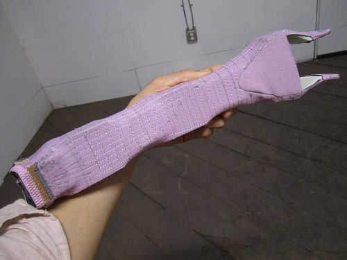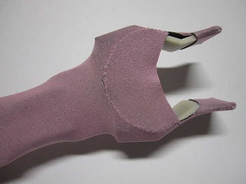 La capa de la carne se cose juntos en un tubo y luego las solapas de la tela en el extremo dobladas sobre y cosidas para hacer los bolsillos para los dedos de la mano de robot. Doblar primero la tela por la mitad (lados de la tela hacia dentro, lados de la goma hacia fuera) en el eje de simetría (ver plantillas) y coser la primera costura a lo largo de la longitud del brazo. Luego plegar las aletas del dedo (ver plantilla) y coser estas juntos, frente a lado de la tela en, lado de goma hacia fuera.