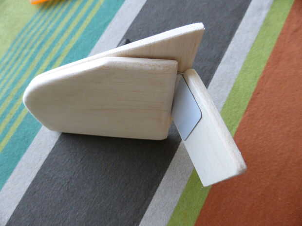 - Tomar una pieza de madera de balsa que apenas cabe en el orificio en el extremo de las alas.