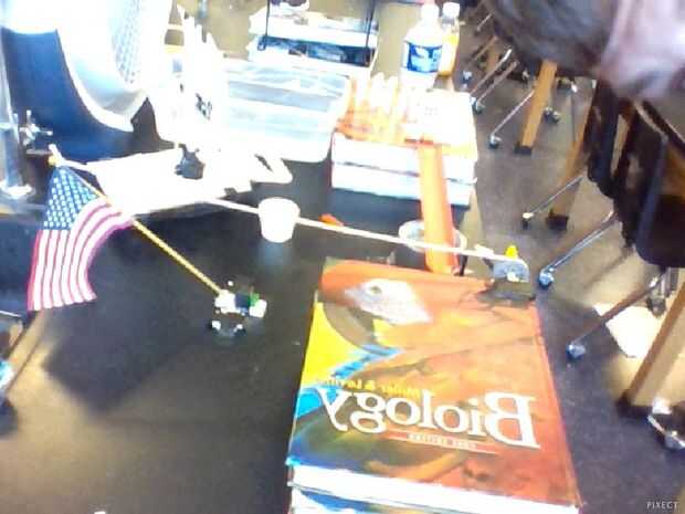 El peso del mármol tira de la polea de abajo, que se une a la bandera. Como la polea se mueve hacia abajo, levanta la bandera. La polea se hace de una taza de condimento, hilo y una rueda de la polea, que era un pedazo de k'nex. La bandera se une a un lego y k'nex base.
