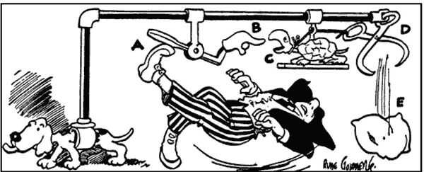 Informar a los alumnos que hoy van a conocer a otro artista inspirador, Rube Goldberg. Rube era un caricaturista que fue inspirado por los latoneros y los inventores. Crea divertidos dibujos de "inventos" que utiliza una cadena de eventos divertidos para el efecto deseado. Mostrar a los estudiantes las imágenes de los dos dibujos comics Rube Goldberg y caminar a través de cada paso de la mordaza.
