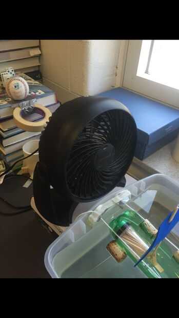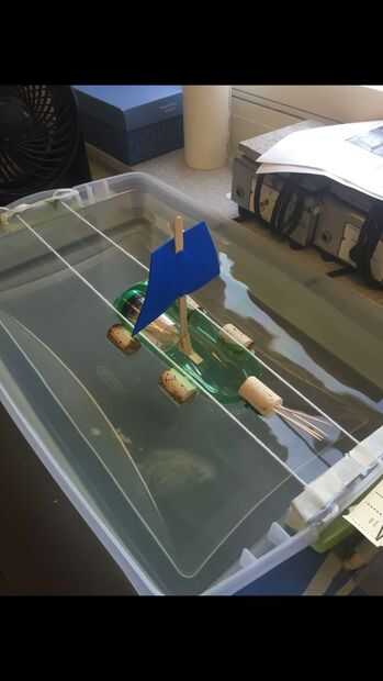 El ventilador empuja entonces el barco, que está en el recipiente de agua, hasta el final del envase.