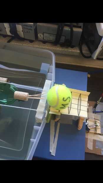 Al final del barco, hay palillos. Cuando llega al final, los escarbadientes golpear la pelota de tenis que reposa sobre una rampa más pequeño.