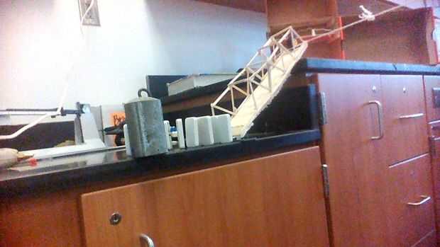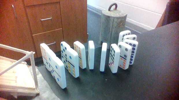 Como se describió anteriormente, las fichas de la tercera fila luego de la caída, el último de los que caen de la mesa que luego tira el peso sí mismo abajo para dar lugar a la acción final de la máquina de Rube Goldberg. El dominó y el peso están ligados uno al otro para que cuando baje el domino la trae la fuerza de la gravedad el peso así.