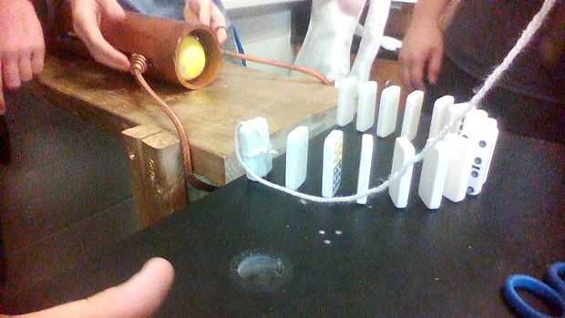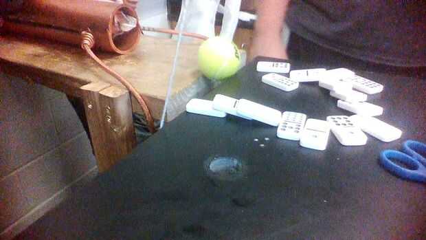 Fichas de dominó fueron un regalo para los fabricantes de máquinas de Rube Goldberg. Debido a esto decidimos utilizar fichas en varios pasos a lo largo de la máquina como mecanismos desencadenantes o conexiones entre mecanismos algo. Este primer conjunto de fichas de dominó se utiliza para transferir la energía desde el lanzamiento de pelota de tenis en una serie de fichas de dominó que termina con el final dominó caerse el plano del proyecto, que se explica más como una parte del siguiente paso en el proyecto. Esta fila se compone de 16 fichas.
