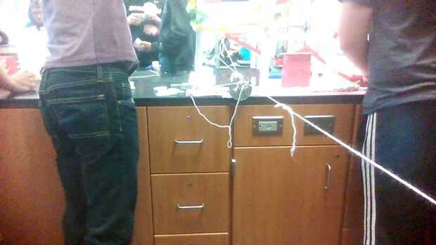 HICIMOS una sierra, sí bien ser celoso. Nuestro primer objetivo fue utilizar un circuito batería-motor que sería algo como un ventilador de lame o tal vez un coche cojo. Pero entonces Carson tuvo la idea de utilizar el motor para cortar una encordada. Lucas entonces en forma de una tapa de lata en improvisadas-hoja de sierra que en unión con un poco de pegamento caliente y una batería con cable de circuito para hacer un trabajo vio. El circuito se completa cuando el final dominó en la segunda fila de dominó aterriza en el circuito abierto. Se cierra y completa el circuito porque se cubre la mitad superior de la pieza del dominó en conductores de aluminio. Entonces se activa la sierra eléctrica para posteriormente cortar una cadena que cruza zz