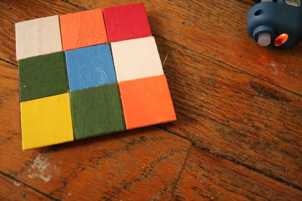 Finalmente, utilizar toques de pegamento caliente para adherir 9 plazas a la vez en un cuadrado de corcho. Mezclar y combinar los azulejos pintados para una mirada de encargo única!