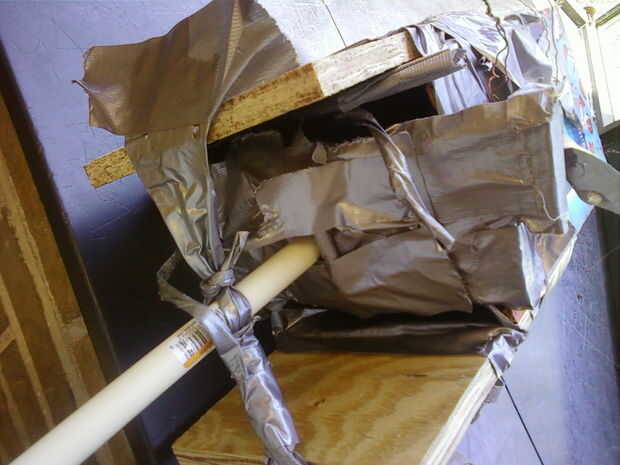 De la plataforma de un sistema de apoyo, nos contaba lo siguiente, y luego alguien lo rompió, así que improvisó y vino para arriba con esto con la madera rota y sobrante de cinta.