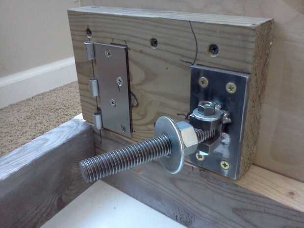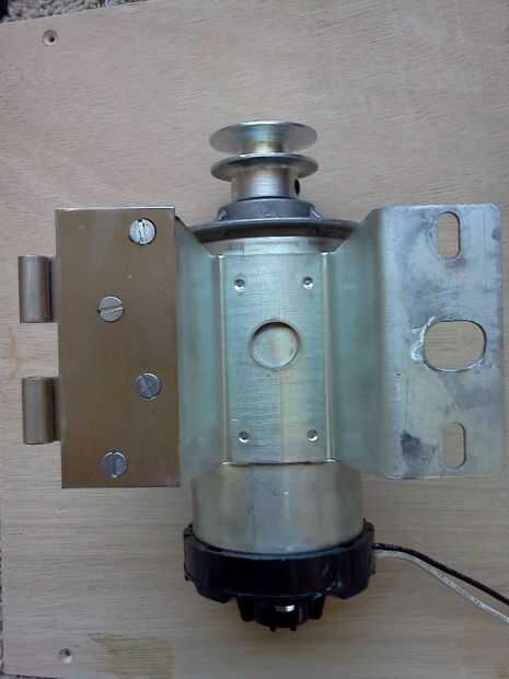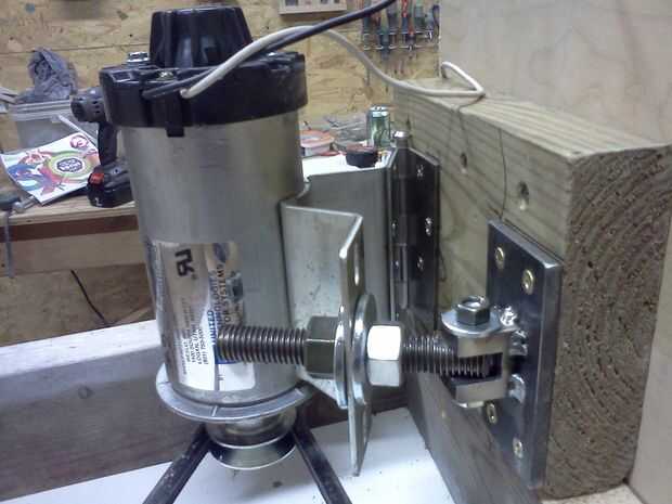 Ahora es el momento de montar el motor. A veces es posible reutilizar la bancada original / correa a tensor de la caminadora. Mi caminadora no tenía nada para trabajar con. El motor tiene un soporte de montaje que se le atribuye, el soporte tiene 2 bridas con 2 agujeros en cada uno. En una pestaña atornillados a un lado de una bisagra de puerta 4" servicio pesado. Al otro lado de la bisagra tiene atornillado en un bloque de madera que montado en el interior pared de la base. La segunda pestaña tiene un orificio de diámetro alargado 3/4" perforado en el centro de la misma.  Hice un tornillo conector de 5" pedazo de varilla de 5/8" roscadas. Pasa por el agujero alargado hasta un bloque de acero, soldada a una placa y sujeta a un bloque de madera mencionado anteriormente. Una ranura ha sido mecanizada en el bloque y perforar un orificio de un tornillo sujetar la varilla roscada. Pueda girar la varilla roscada para ajustar el ángulo de la brida del motor como los cambios de tensión de la correa. Dos 5/8" tuercas y arandelas se agregan a la varilla roscada. Uno por debajo de la brida y una encima de la brida. Puede girar la tuerca inferior de cualquier manera para ajustar la tensión de la correa. Luego se aprieta la tuerca superior para bloquear el ajuste en su lugar. Usé un 1/2" v-belt que es 48" de largo.