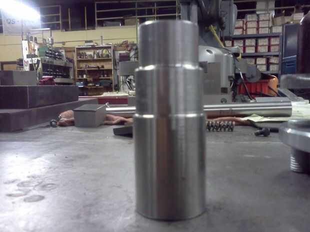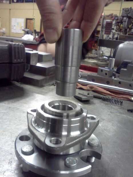 cumplí una pieza de 1 1/4" redondo de stock en el torno. Disminución del diámetro de una sección larga de 2" del eje a de.900 a encaja perfectamente en el agujero de centro de asambleas hub (donde iría el eje de la c.v. de automóviles). Dio vuelta la punta del eje abajo más pequeños para caber firmemente en estriado sección de montaje del eje de la.  Luego cortar el árbol a aproximadamente 4" largo y perforado y golpeado ligeramente un agujero en el extremo opuesto a aceptar un 1/2" diámetro perno que llevarán a cabo la polea. A continuación he insertado dado vuelta abajo el extremo del eje en el montaje del eje. Aunque cabe muy bien, he añadido un par de soldaduras para virar en lugar sólo para asegurarse que no resbale.