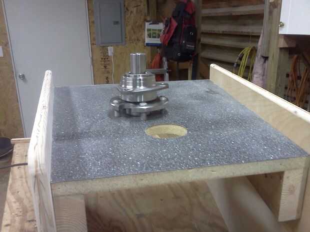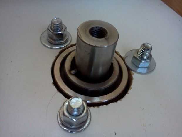 determiné que quería que el centro de mi rueda de cerámica que se encuentra en la parte superior de la base. Luego coloca el ensamble del rodamiento sobre ese lugar y rastrear su forma en la parte superior. Usé una sierra caladora para cortar el orificio para el cojinete de la rueda.  Usé tres pernos de 7/16" para fijar sólidamente el ensamblaje de rodamiento a la superficie.