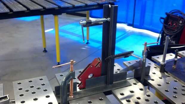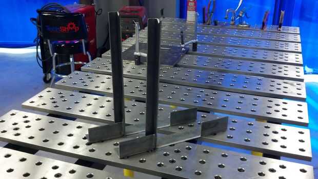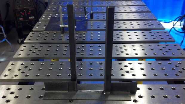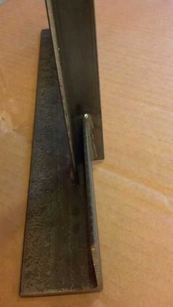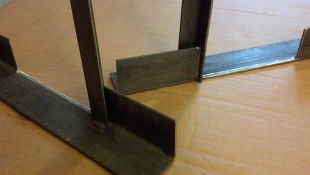 La idea es soldar en posición uno vertical a base de una pieza, luego repita así que terminas con dos unidades idénticas. Podrían hacer éstos individualmente pero quería asegurarse de que las columnas fueron incluso y las muescas alineadas para que todo lo sujeta juntos y tachuela soldada con autógena las piezas primero.
