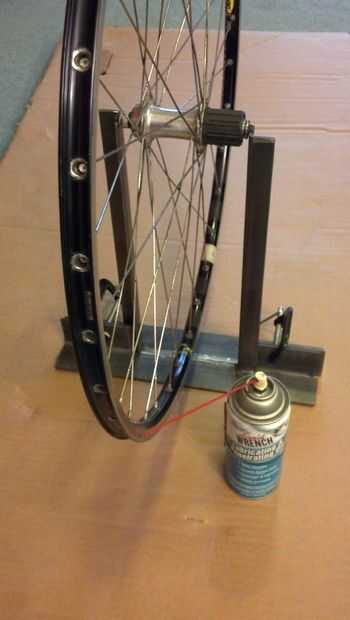 Esto es una rueda bajo coste nivelado soporte y carece de cualquier pinzas o guías para mostrar la veracidad de la rueda o redondez. Actualmente utilizo la boquilla de la extensión de una lata de lubricante para servir como una guía. Funciona bastante bien para los dos o tres veces al año cuando construyo una rueda. Si consigo ambicioso puedo crear un juego de pinzas que se conectan magnéticamente a la base.