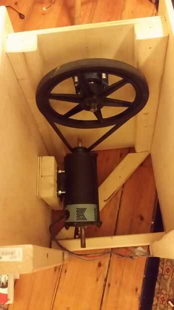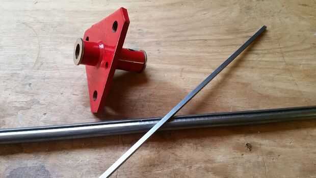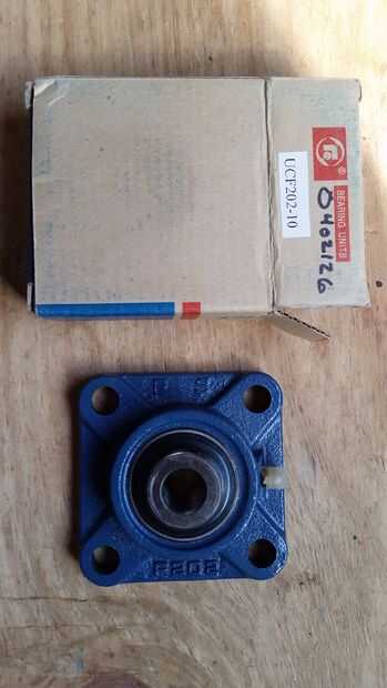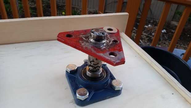 Para ahorrar tiempo he comprado la rueda de la polea. No tienen acceso a un torno, usé un sujetador de cuchilla de tractor soldado a un eje de diámetro de 5/8" y dos rodamientos.