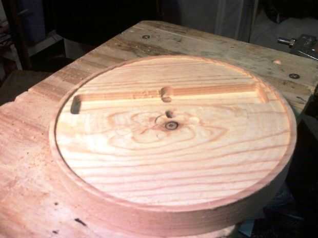 Usando el agujero que se hizo por perforación en el tablero para marcar el diámetro externo, utilizarlo como una referencia a dremel la superficie interior de la llanta, sobre un 1/8" de profundidad. Tenía dremel un círculo completo y luego cambiar la profundidad de la guía para cortar radios más pequeños y más pequeños hasta la depresión toda fue suave.