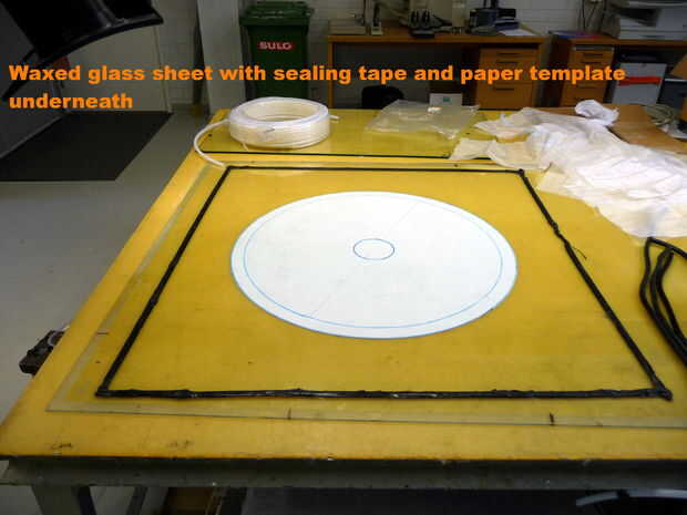 Cualquier superficie se utiliza como un molde, debe ser limpiado y preferentemente sellados mediante un agente de sellado o similares. Si se quieren debossed características en las placas laterales, debe sujetarse al molde en este punto. Vinilo funciona muy bien porque tiene una superficie adhesiva ya y no adherirse fácilmente a la resina. El texto se debe cortar espejo para que salga de la manera correcta (de izquierda a derecha) en el producto final. Cinta de sellado debe establecerse (para procesos de bolsa de vacío) antes de encerar el molde. Además, todas las capas necesarias deben cortarse antes de encerar el molde, sobre todo el refuerzo. Agentes de liberación de molde pueden ser sustituidos con la cera de carnauba o alguna cera para automóviles. Una plantilla de papel que la rueda es útil para realizar un seguimiento de cuánta área es necesario.