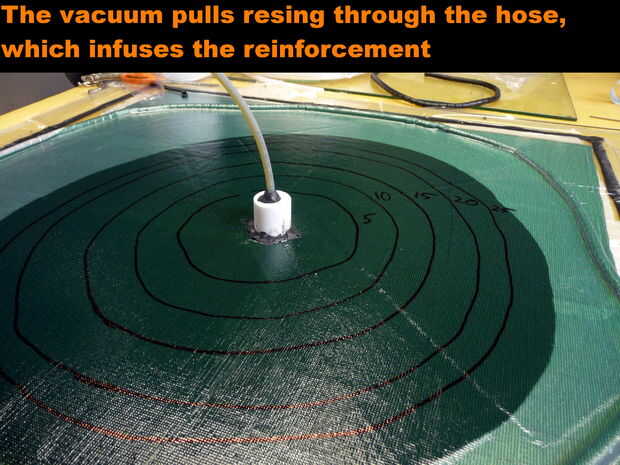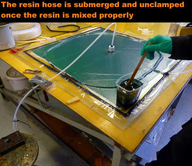 10. mezclar los componentes de la resina y sumerja la manguera en la resina. Asegúrese de que no hay aire es introducido en la bolsa junto con la resina. Flujo de resina debe controlarse mediante la regulación de la presión en la manguera o la manguera de la resina de fijación. Con una velocidad más lenta se asegurará de que las capas están uniformemente húmedas. Un sistema de resina fina facilitará el proceso más rápido y humedecer. La laminación que se muestra aquí tomó unos 45 minutos porque el sistema de resina de nanotubos dopado carbono tenía una alta viscosidad.