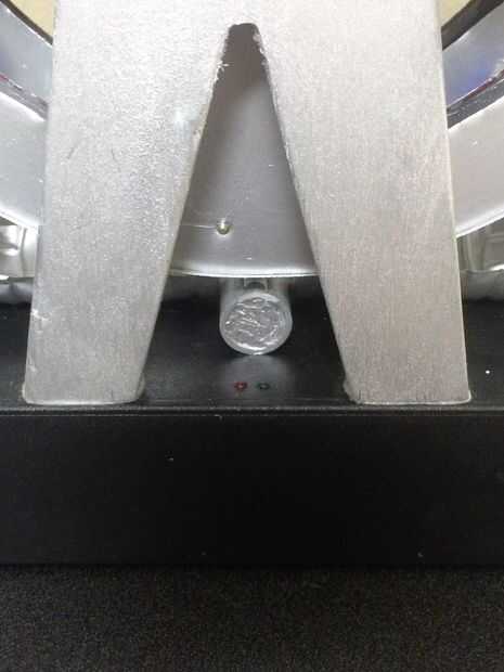 El siguiente paso es pegamento caliente el servo en su sitio para que no se mueva mientras la rueda de la fortuna está en movimiento. Una vez que el pegamento se haya secado, que no toman muy largo, es finalmente tiempo para asegurar la otra pata de la caja negra. Colocar epoxy en la parte inferior de la pierna con la forma de U y pégalo al borde mismo de la caja negra en la parte que se señala como el frente. Esto debe estar centrado sobre los LEDs en la tapa de la caja negra (referencia de la imagen si confundido sobre donde deben ir el LED y la pierna en respeto uno al otro). Que el epóxico reposar al menos 30 minutos por lo que está sellado.