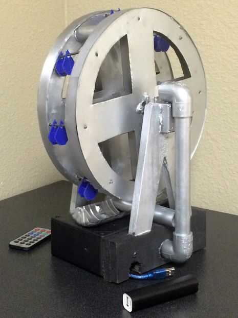 Esperando el epoxi sosteniendo las piernas para que se seque, desenroscar el propulsor del servo. La hélice necesita entonces se ajustaron en el centro de la pared de la rueda de la fortuna que no tiene el tubo de PVC pegado fuera de él. Una vez seco el epoxi para eso, use 4 clavos pequeños y un martillo les a través de pequeños orificios en la hélice por el aluminio para que la hélice no viene suelto de la noria en movimiento. Una vez que la hélice está firmemente en la pared de la rueda de la fortuna y el epoxi para las piernas se ha secado, coloque la parte de tubo de PVC de la noria sobre la U en forma de pierna y vuelva a colocar la hélice al servo. Tendrá que pegar el destornillador y el tornillo a través del tubo de PVC para llegar a la hélice en el otro lado y volver a encajarla. Ahora debe tener la rueda de la fortuna descansando sobre las piernas, conectada al servo y de pie por sí mismo.