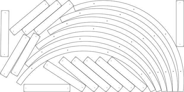 Cortamos los arcos de cuatro hojas de madera contrachapada. Llenamos cualquier espacio no utilizado con listones para ser utilizado para medidas en la rueda de hámster, pero corte la mayoría de las tablillas rectangulares por tabla VI.