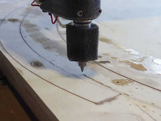 Este proyecto sin duda se completen con herramientas ordinarias y artesanía. Las piezas del arco son los más difíciles de hacer, ya que su precisión es clave para suavizar el funcionamiento de la rueda. Una cadena cuidadosamente medida utilizada como brújula podría utilizarse para dibujar los arcos de una pieza de contrachapado, que podía cortarse con una sierra de calar. Un router de mano con una plantilla y un poco de ajuste haría duplicación bastante hacia adelante. Ambos trabajamos en la sede de Instructables en Autodesk muelle 9 y tener acceso a un gran cortador de chorro de agua OMAX. Máquina que utiliza un chorro de agua de alta presión para cortar a través de cualquier material, siempre y cuando sea menos de 6" de espesor controlado por un ordenador. Madera, cualquier metal, vidrio, piedra, cualquier forma, cualquier material. Usted parece loco a cortar la madera con agua, pero nos ha salvado muchas horas de elaboración de la plantilla y salvó un montón de madera porque podríamos anidar las piezas dentro de 1/8" de cada uno. Además, la precisión de balanceo liso y perfecto registro de las piezas apiladas a Asamblea.