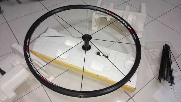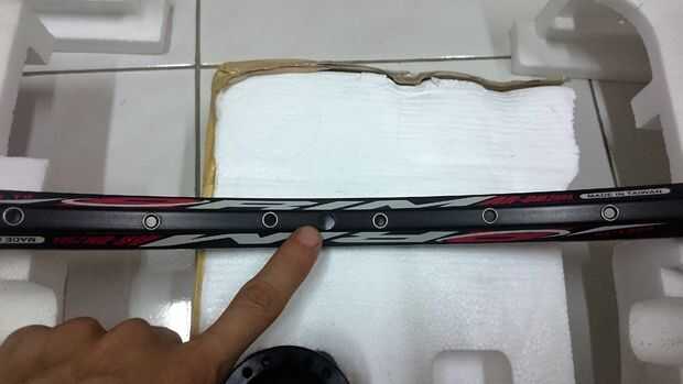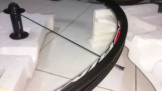 Luego seguir con todos los rayos rojo, concretamente en el agujero 4, 6, 8, 10, 13, 15, 17 en el centro contando hacia la derecha. Sobre la brida del eje dejamos 2 agujeros de entre 1-4 y 10-13. En el borde, dejamos 3 agujeros entre dos radios.