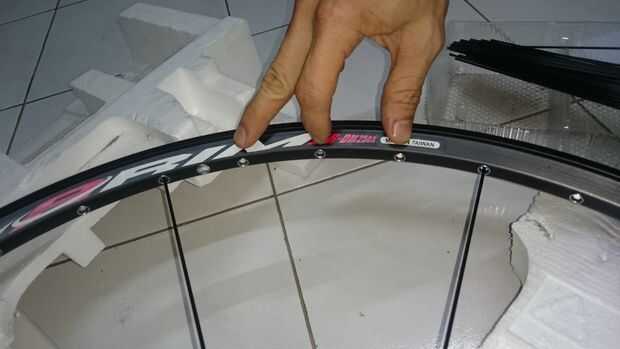 En primer lugar estamos trabajando con todos los fuera-en radios. Poner su habló primero en un orificio del eje entonces pasar por el agujero en el borde que está un poco (ya sea a la izquierda o la derecha del orificio para la válvula, está a la izquierda en mi caso). Luego coloque el pezón en el rayo para que encaje en el borde. Cinco o seis vueltas en el pezón es bueno.