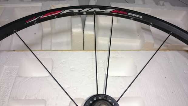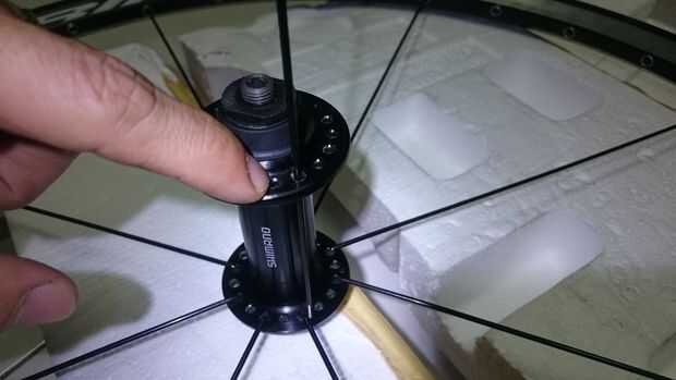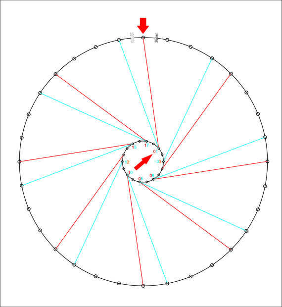 La primera azul habló lateral va a la derecha del rayo rojo inicial en el borde. ¿En mi hoja de trabajo, el azul a la izquierda de los rojos porque es visto desde el lado de no conducir, hemos volteado la llanta recordar? Es bueno si se puede imaginar que sus rayos tienen colores, de lo contrario... Usted puede marcar con notas adhesivas de color. Ahora poner todos los rayos azules en el centro es decir número de agujero 3, 6, 8, 10, 12, 15, 17. Los rayos azul va a los agujeros derecho siguiente de rojos en los bordes.