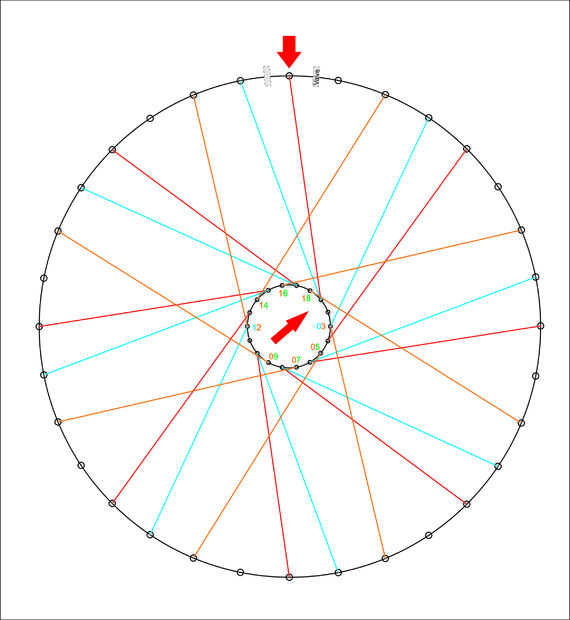 Inicio del hoyo #3 en el cubo (de adentro hacia afuera), el rayo naranja va hacia la derecha y haga tres Cruz a tres radios rojos. La primera Cruz es de la anterior (arriba), la segunda cruz desde arriba (arriba) y la tercera Cruz es desde el abajo (abajo) el rojo habló pasadas. Puede que necesite doblar el rayo un poco para traer abajo el otro habló. No doble demasiado. Luego va a la izquierda del rayo azul en el borde. Es así que entre un rayo azul y un agujero blanco en el borde después de cruzar tres rayos rojos.