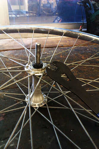 Después de que se han mudado las tuercas a lo largo del tornillo, apriete las tuercas contra la otra en un extremo, luego apriete lentamente cono de la otra parte en los cojinetes. Prueba la sensación de la rueda, queremos una combinación de torneado liso y Ondulación baja (juego). Cuando tienes derecho a continuación apriete la contratuerca de la otra parte y probar otra vez.