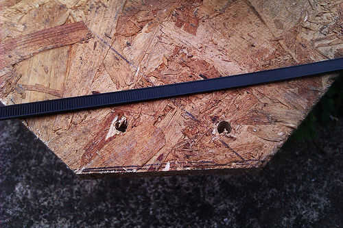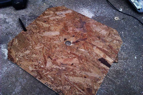 Cuando esté listo perforar otro agujero grande en el medio para las tuercas de la rueda. Luego perfore agujeros más pequeños en cada esquina que tu tamaño de atadura de cables.