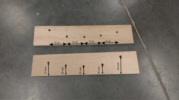 Tome los 2 trozos pequeños de 355 X 70 mm y taladrar los agujeros como el patrón en las fotos. Asegúrese de que ellos se reflejan, por el contrario, cuando se pone en la estructura de los agujeros no será simétricos.