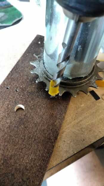 El rollo con el trinquete y colocar en el último agujero. Ahora 3 perforaciones redondo el trinquete sin perfora la madera. Esto es para poner los tacos para fijar el trinquete.