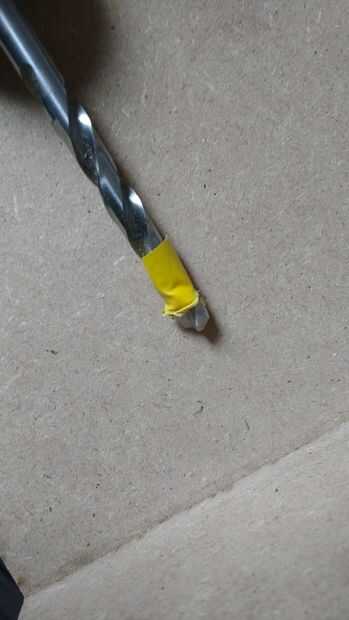 Algunos agujeros cruzan totalmente la placa. Un Consejo para esto es marcar la profundidad que se desea perforar con un trozo de cinta (como en la imagen). Fije la cinta a más o menos 6 mm de la punta de la broca. Cuando este toca la madera usted sabe que usted tiene que parar la perforación.