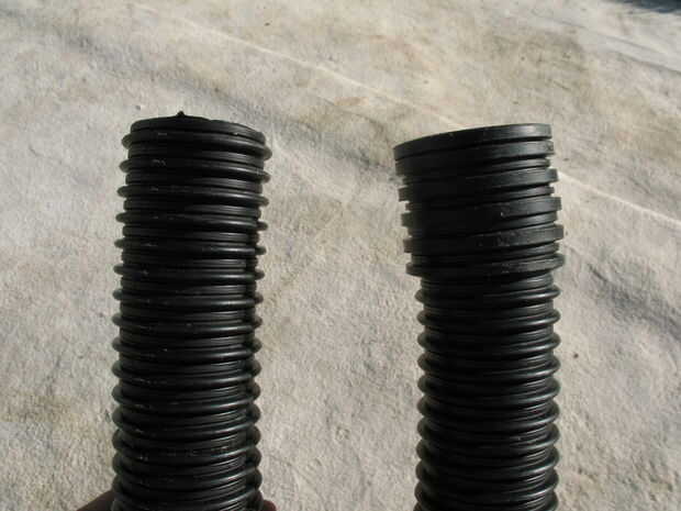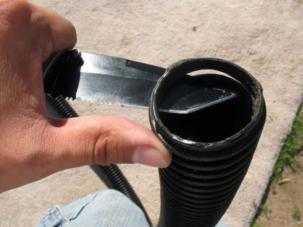 Ahora, dependiendo de la longitud de la manguera y el tamaño de su neumático, puede o no puede necesitar cortar la manguera para ajustarse perfectamente alrededor del borde. Además, ten en cuenta que los extremos de la manguera pueden ser diferentes del que tenía, y quizás tenga que quitar algunos adaptadores o accesorios de plástico duros. Para hacer el cierre más fácil, es mejor seguir el interior surco cuando se corta la manguera. (fig. 1)