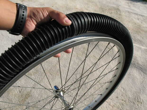 Una vez que la manguera cerrada usted puede (si es tamaño correctamente) simplemente estira sobre el borde, y sólo debe sostenerse en su lugar. (fig. 2) Opcionalmente, puede utilizar ataduras de cremallera para asegurar la manguera a la llanta, utilizando como muchos como creas necesarios. Tenga en cuenta que ataduras de cremallera son casi un requisito en cualquier cosa superior a 120 RPM.